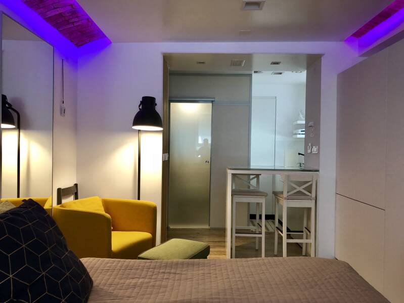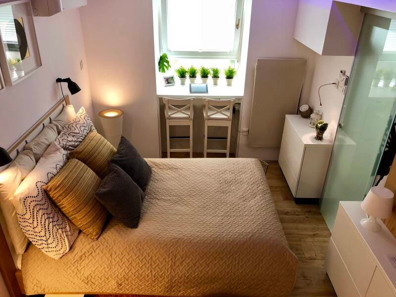 The studio apartment is located at Ksaver 195, Zagreb, in the Ksaver residential and business complex, and has a total area of 18 m². The studio contains a living room with a single bed in the gallery, a toilet, a shower, a kitchenette with a refrigerator and is not suitable for two people. The price after one month is €500 (variable depending on the length of stay). The price includes all utilities, with no additional hidden costs. It is important to note that the apartment does not have natural lighting, which makes it less suitable for those for whom daylight is a priority, but the space is very well equipped with indirect lighting that ensures a pleasant ambiance.